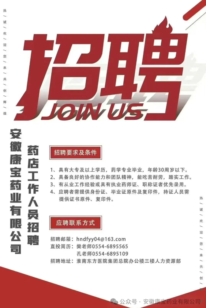 安徽康寶藥業有限公司藥店工作人員招聘
